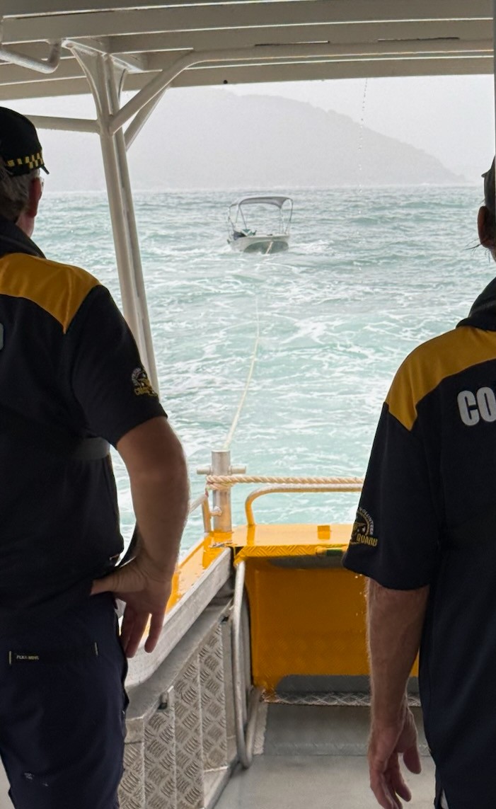 The Coast Guard crew arrived after a very rough trip and managed to transfer the wife and children into the rescue vessel, while the husband steered the tinnie while under tow. It was then a very slow and rough trip back, with very sea-sick passengers, but all were landed safely at Dungeness after a delay due to the low tide.