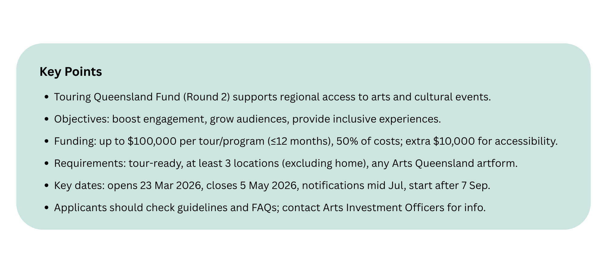 The Touring Queensland Fund (The Fund) Round 2 is focused on supporting regional communities’ access to high quality arts and cultural products and events, including music gigs to foster a vibrant arts scene, underpinned by the values of respect, opportunity, and aspiration, where art is celebrated, and every Queenslander is welcomed. The Fund supports delivery of the key priorities of the Queensland’s Time to Shine: 10-year arts and cultural strategy