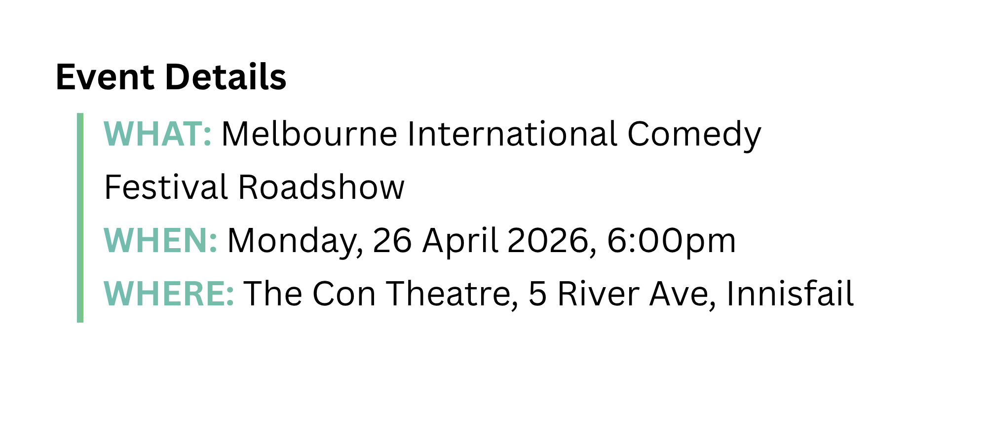 The show will take place at the Con Theatre in Innisfail, with doors opening at 6pm ahead of a 6:30pm start. The performance will run for approximately two hours, including a short intermission.