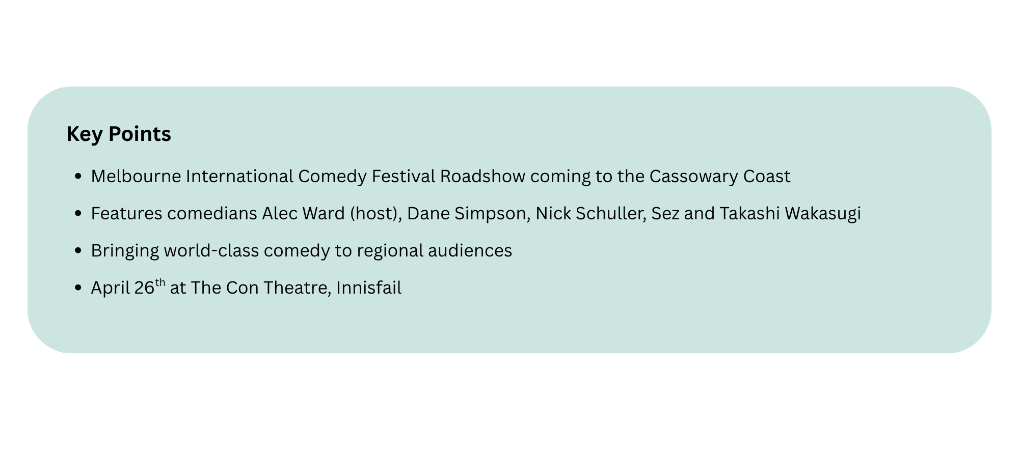 The laughs are rolling back into town, with the Melbourne International Comedy Festival Roadshow set to light up the Cassowary Coast later this month.