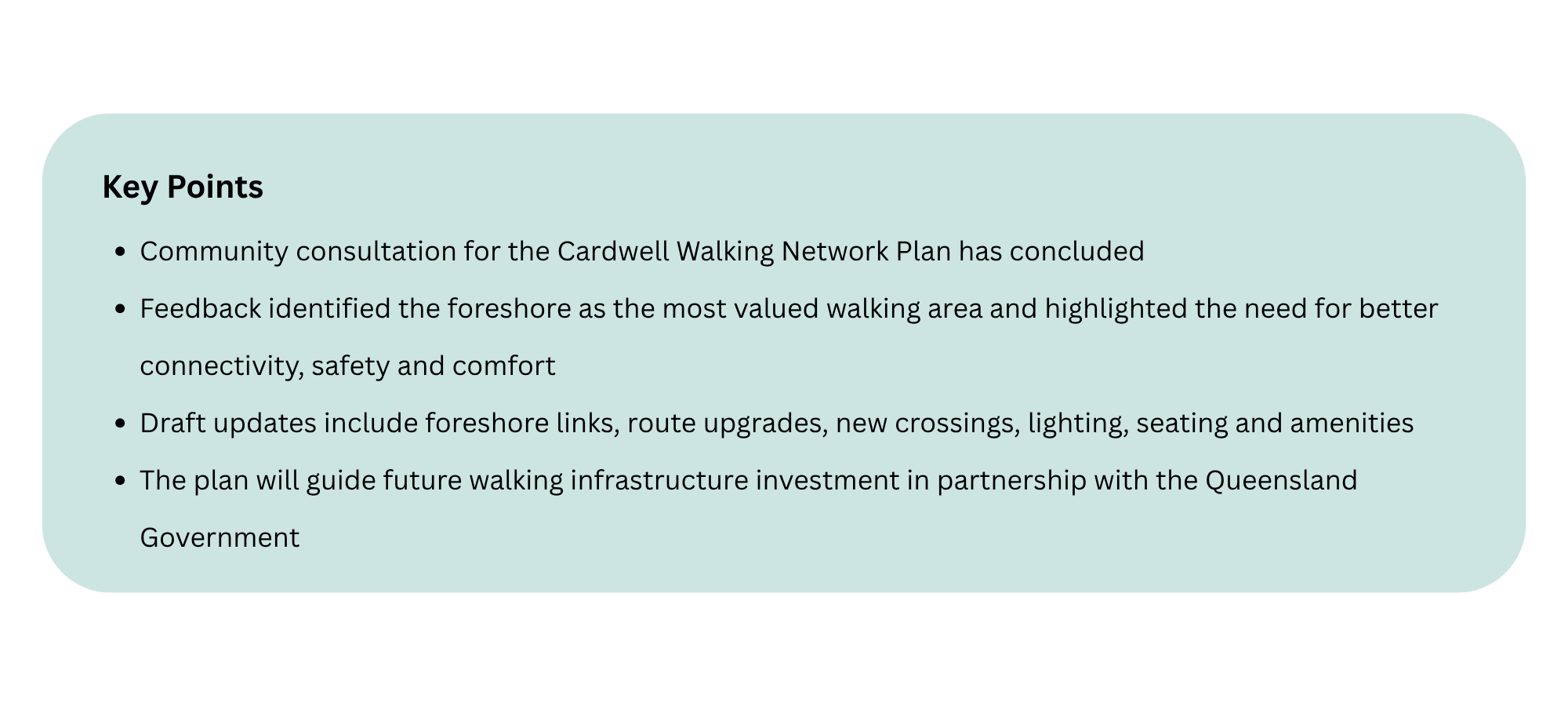 Council will now work with TMR to finalise the plan, which will help guide future investment in walking infrastructure across Cardwell, subject to available funding.