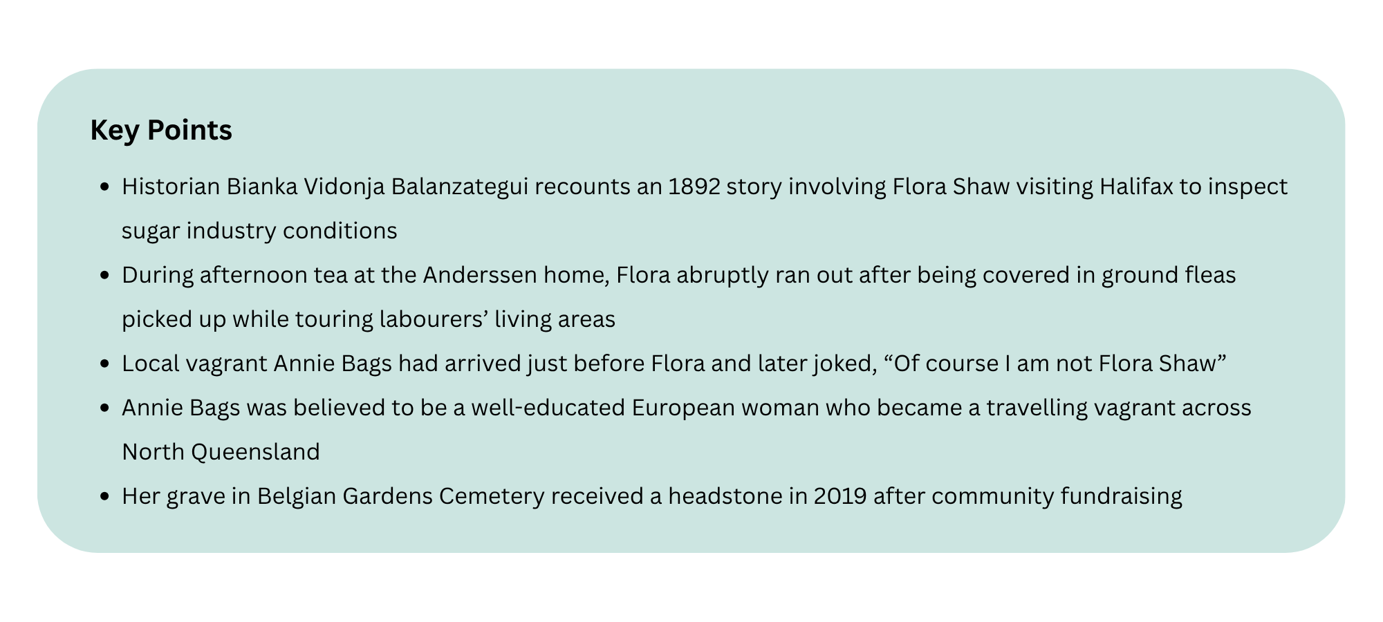 Swedish immigrant and small farmer’s wife Gussie Feldt recounted the day in 1892 that a well-known vagrant woman, Annie Bags, passing through Halifax knocked on August Anderssen’s door. On that fateful day Eva, August’s wife, had just set up a dainty afternoon tea in the parlour for Flora Shaw, renowned British journalist, author, and staunch imperialist who was in the district to see for herself the state of the sugar industry as it prepared to transition from indentured Melanesian labour to free white labour. Her findings were published in The Times in 1893.
