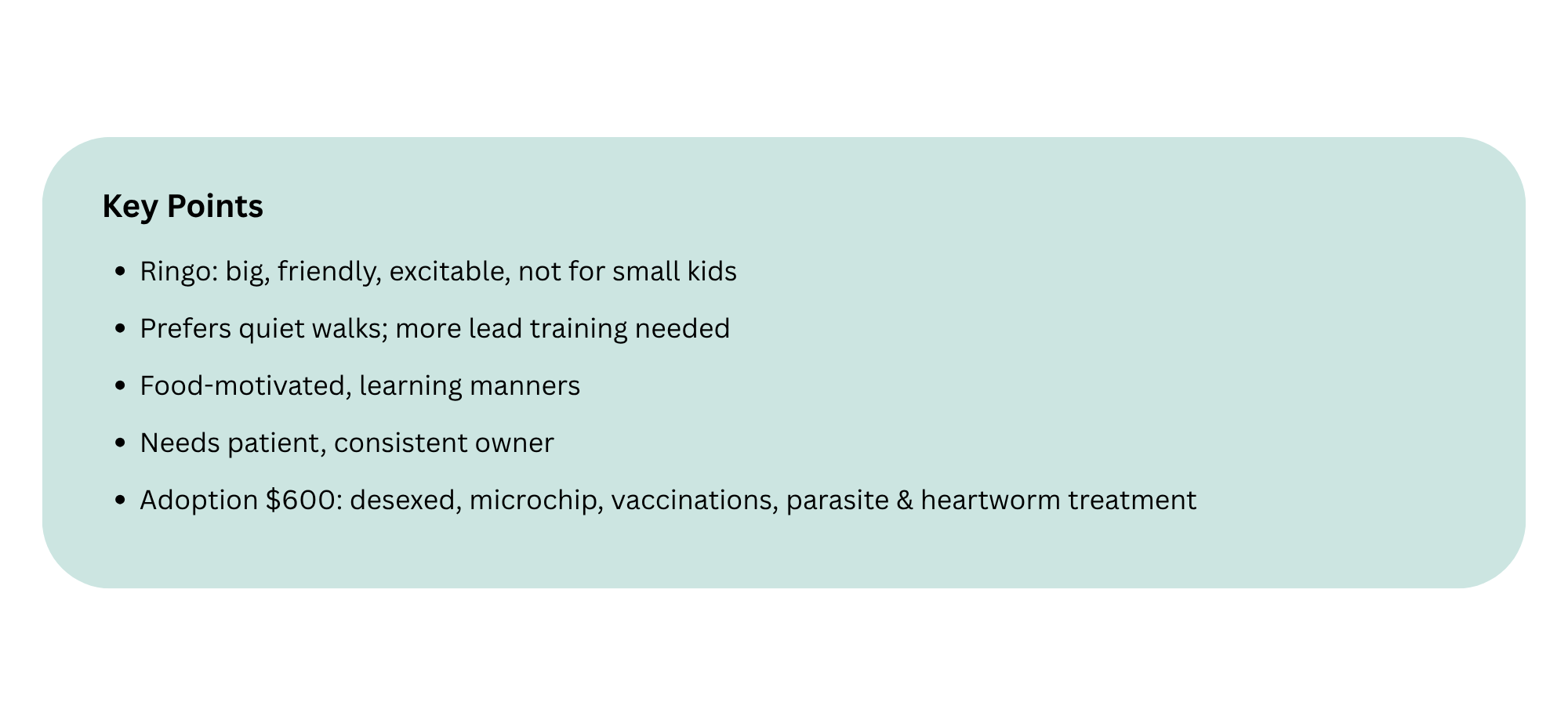 Included in adoption fee of $600 desexed, micro-chipped, up to date vaccinations, flea/tick/intestinal worm treated & on heartworm preventative or Proheart.