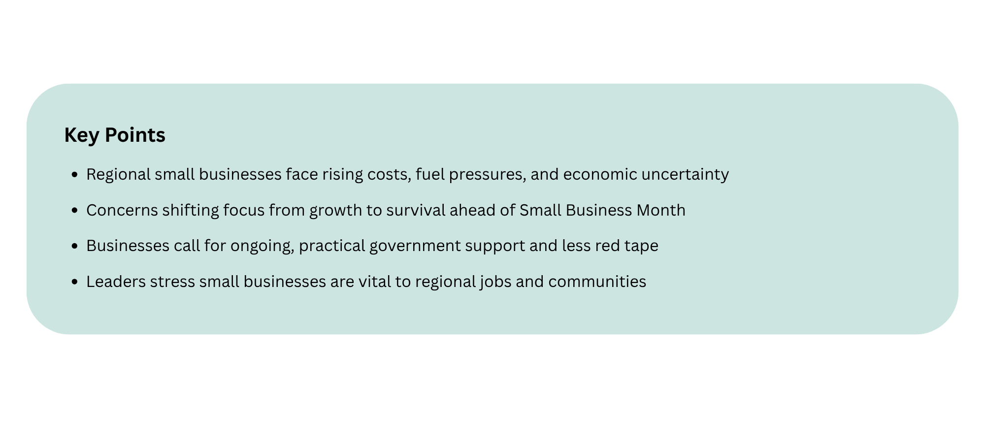 “Right now, one of the biggest pressures on our small businesses is rising operational costs, further impacted by uncertainty around fuel. In regional areas, that hits hard,” Mayor Millwood said.