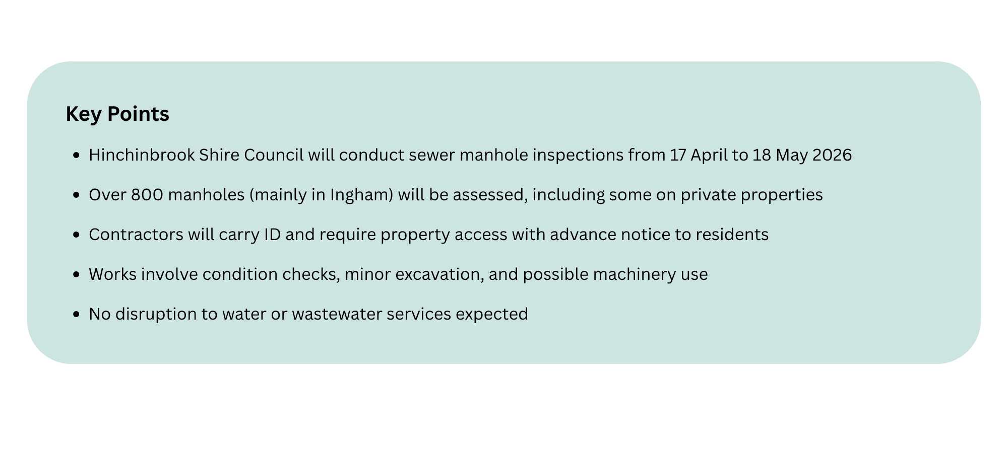 Hinchinbrook Shire Council wishes to advise residents that sewer manhole condition assessments will be conducted from Friday 17 April 2026 to Monday 18 May 2026, weather permitting. The majority of the 800-plus sewer manholes are located within Ingham, many on private properties, and contractors have been engaged to carry out condition assessments requiring access to these sites. Contractors will carry official identification at all times when on-site.