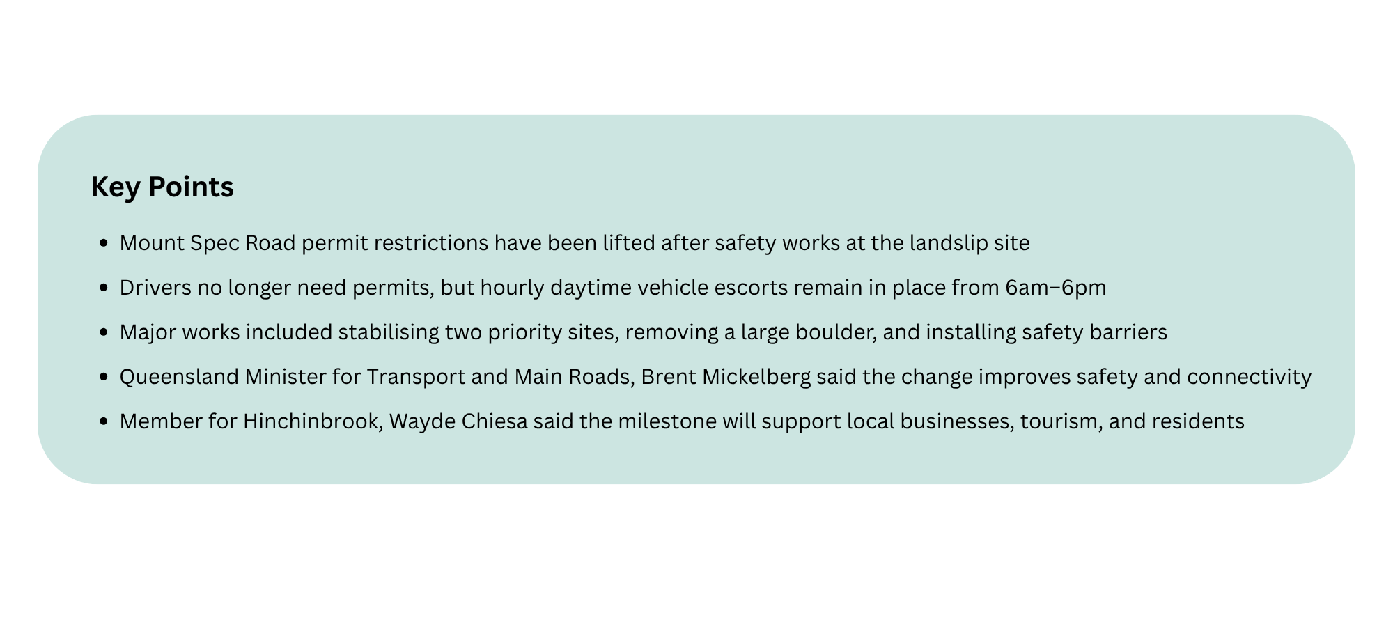 “The Government promised the community we would restore safety at Mount Spec Road, and the lifting of the permit system shows real progress after a challenging period for the community.”